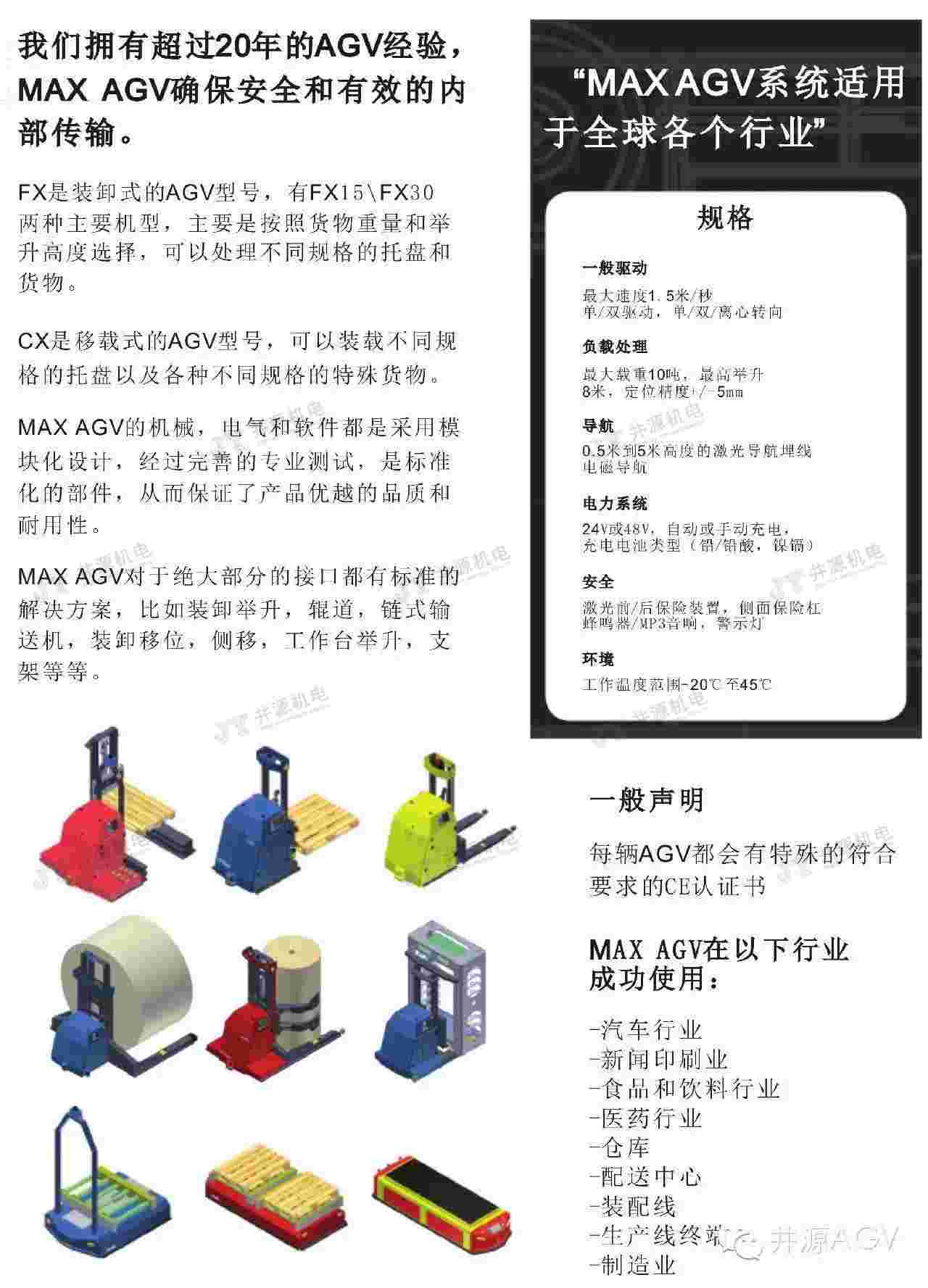 在國內最早推出磁帶導航通用物流AGV,擁有“JYME”和“MAX AGV”兩大移動機器人品牌,形成了包括激光導航、電磁導航、視覺導航、磁帶導航四大系列,300KG-50T的多個規格,叉車型、裝配型、承載型、牽引型等種類完善的產品體系。