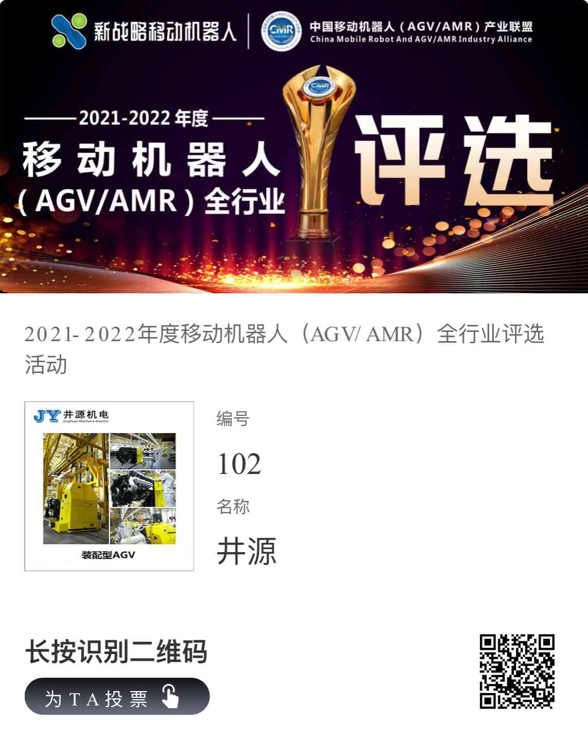 The 2021-2022 mobile robot (AGV/AMR) industry wide selection activity is in full swing. Jingyuan Electromechanical has been deeply involved in the AGV industry for more than 18 years, and has also actively participated in the battle for honor. Please support us from colleagues and users in various industries. Your recognition will be a strong agent for our continuous efforts.