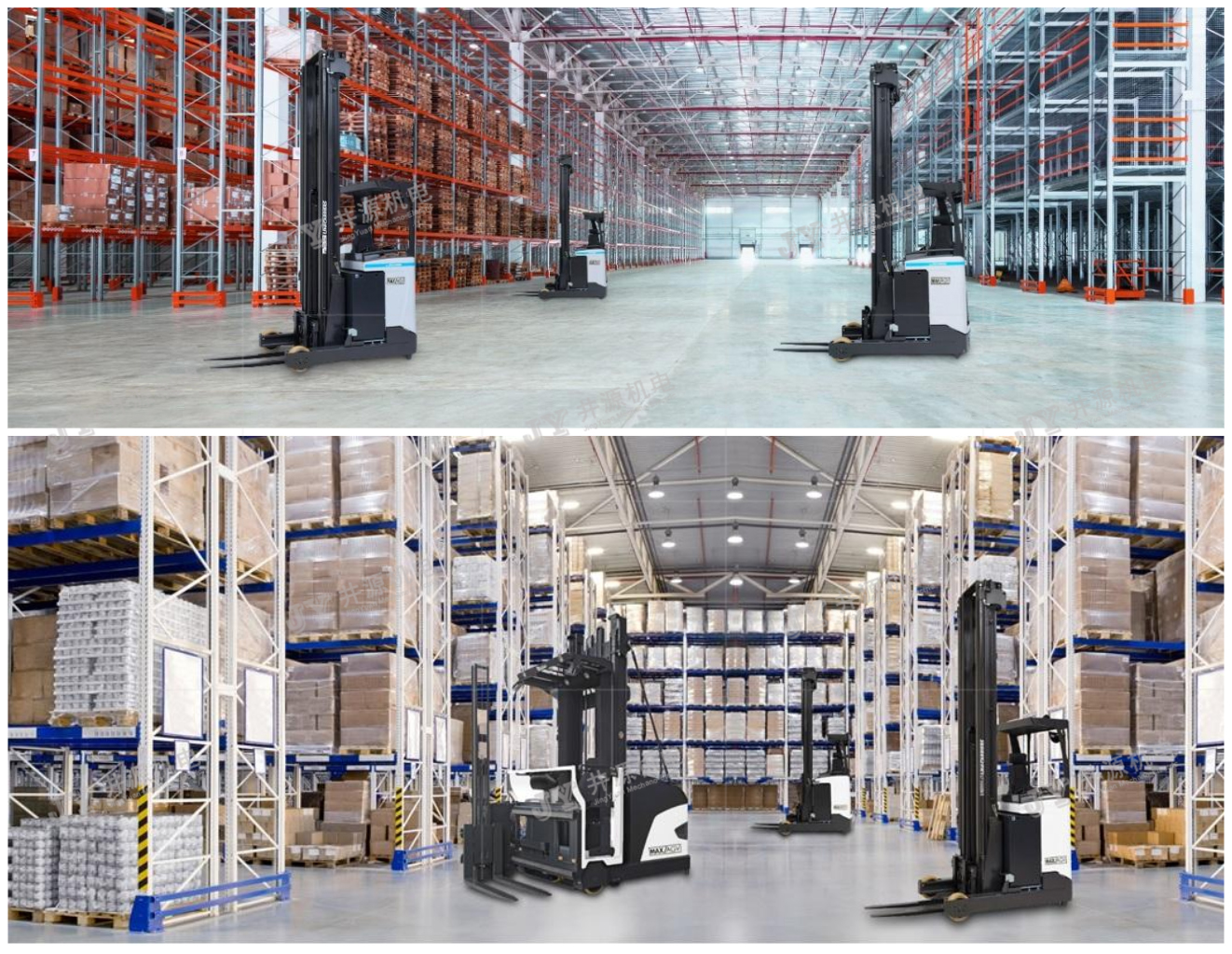 This fork-type AGV has a lifting height of more than 6.5 meters and a load of 500KG-4000KG. It is designed with dual drives and dual steering, and has very flexible maneuverability. The forward and backward speed exceeds 1.5 meters per second. The angle moves laterally; this type of AGV fork arm can extend forward by 1.2 meters, which is especially suitable for narrow space scenarios. Two AGVs in the same roadway can pick and place goods without affecting each other's walking, and the efficiency is greatly improved. At the same time, the spacing of the fork arms can be automatically adjusted according to different goods, and the horizontal angle of the fork arms can be automatically adjusted by ±2.5°.