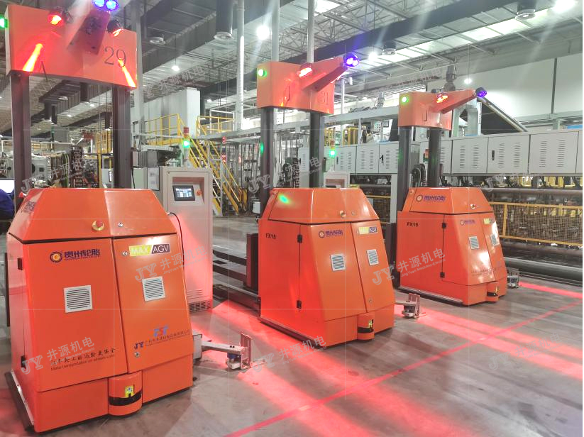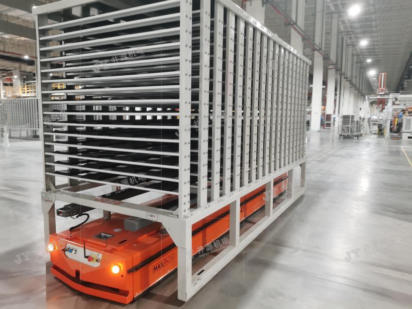 During this process, Jingyuan technical team designs suitable AGVs according to the size, structure, bearing center of gravity, etc. of these tooling/trolleys. Under the scheduling of the AGV system, orderly transportation between different tooling, different loads, and different processes is realized, as well as different areas. intelligent warehouse management. The use of AGV has replaced 3 stackers and conveyor lines for entering and leaving the warehouse, saving more than 3 million yuan in costs for the enterprise.
