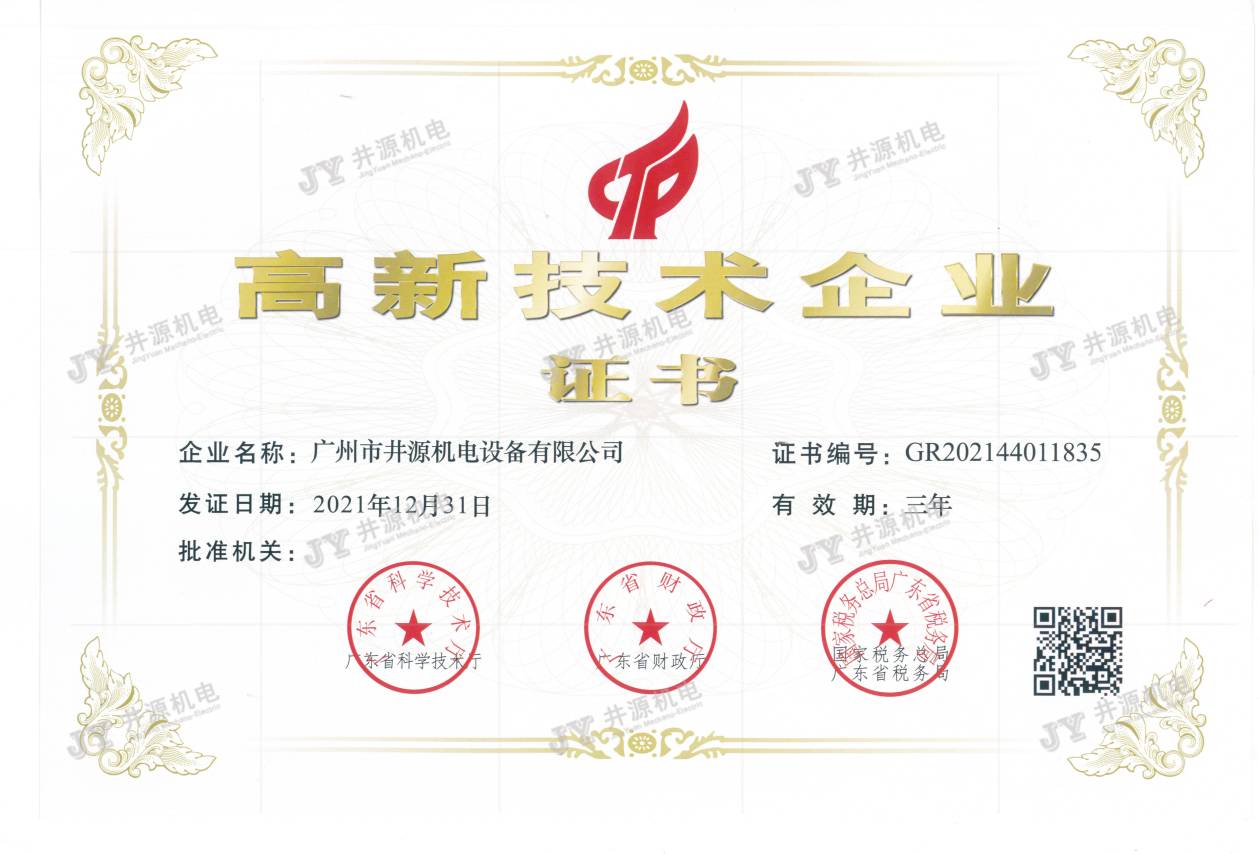 Recently, Guangzhou Jingyuan Electromechanical Equipment Co., Ltd. received the high-tech enterprise certificate issued by the Guangdong Provincial Department of Science and Technology, the Guangdong Provincial Department of Finance, and the State Administration of Taxation Guangdong Provincial Taxation Bureau. Since 2012, Jingyuan Electromechanical has once again passed the re-examination of high-level certification. It is a great honor for government units and industry customers to highly recognize the company's products and technologies.