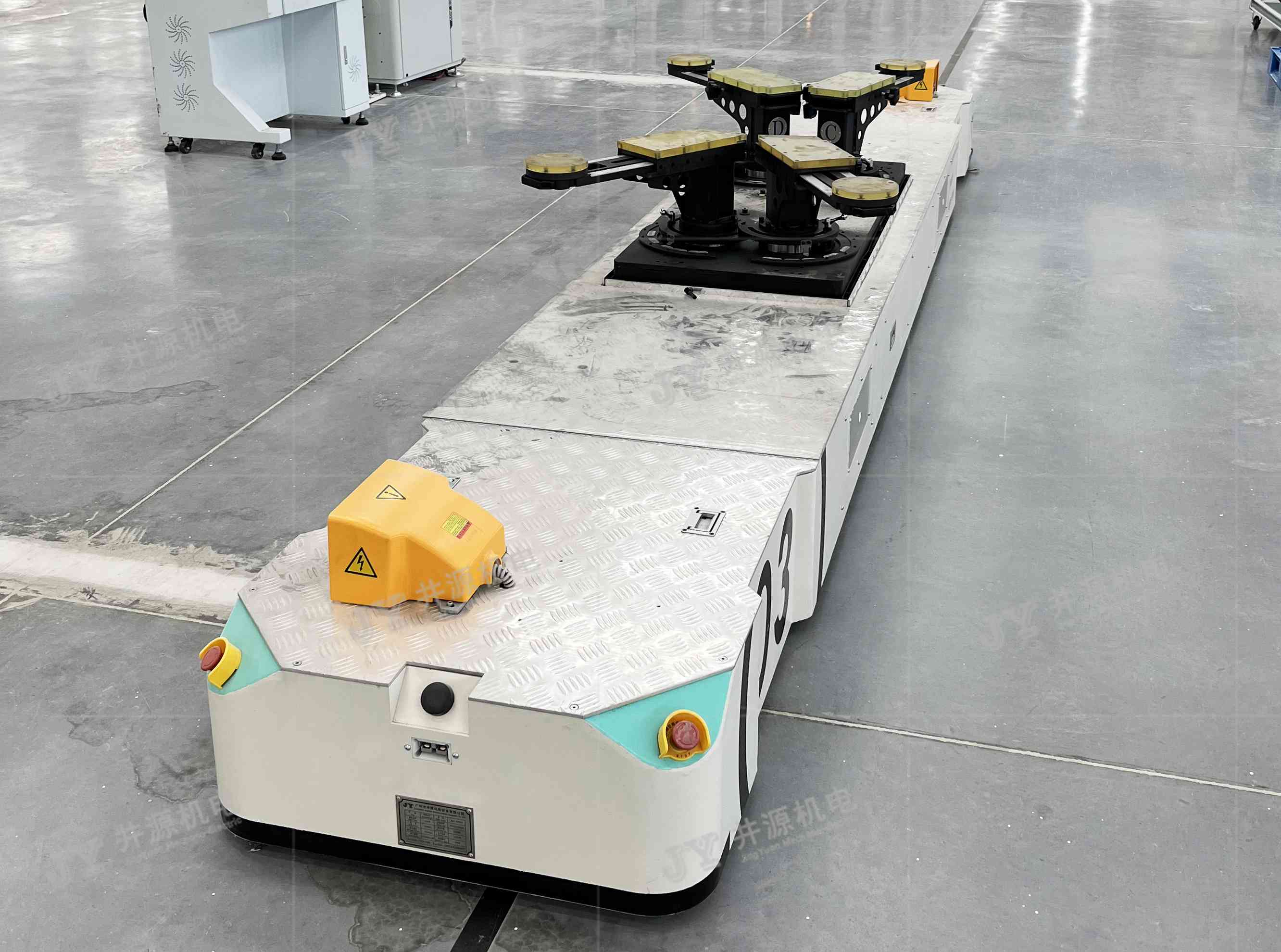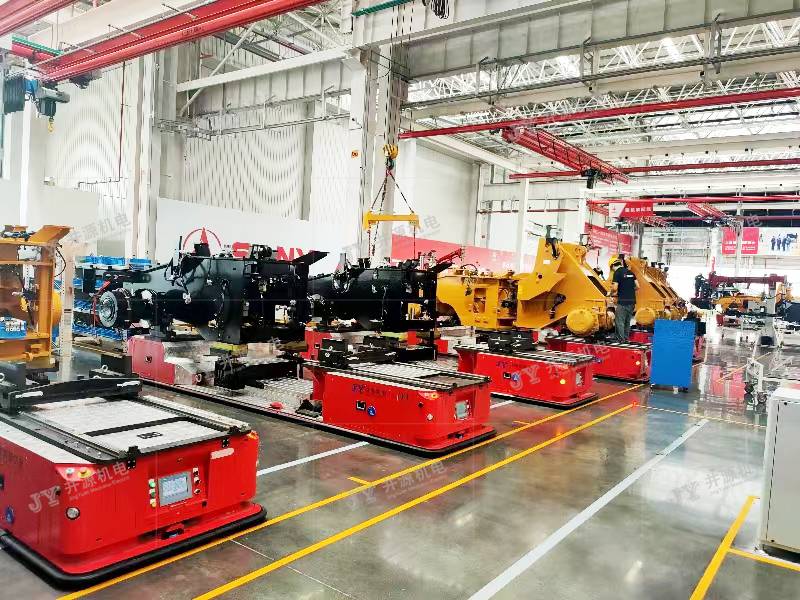 Jingyuan Electromechanical Heavy Load Assembly AGV can be customized with a load of less than 30 tons, mainly used in indoor industrial logistics handling, host process assembly, and auxiliary assembly scenarios. A domestic loader enterprise adopts a 25 ton heavy-duty assembly AGV from Jingyuan Electromechanical to complete the assembly work of the loader assembly line, creating a flexible production line for the heavy industry, achieving intelligent recognition, transportation, management, information exchange and other characteristics of production, reducing labor intensity, and greatly improving production efficiency and quality.